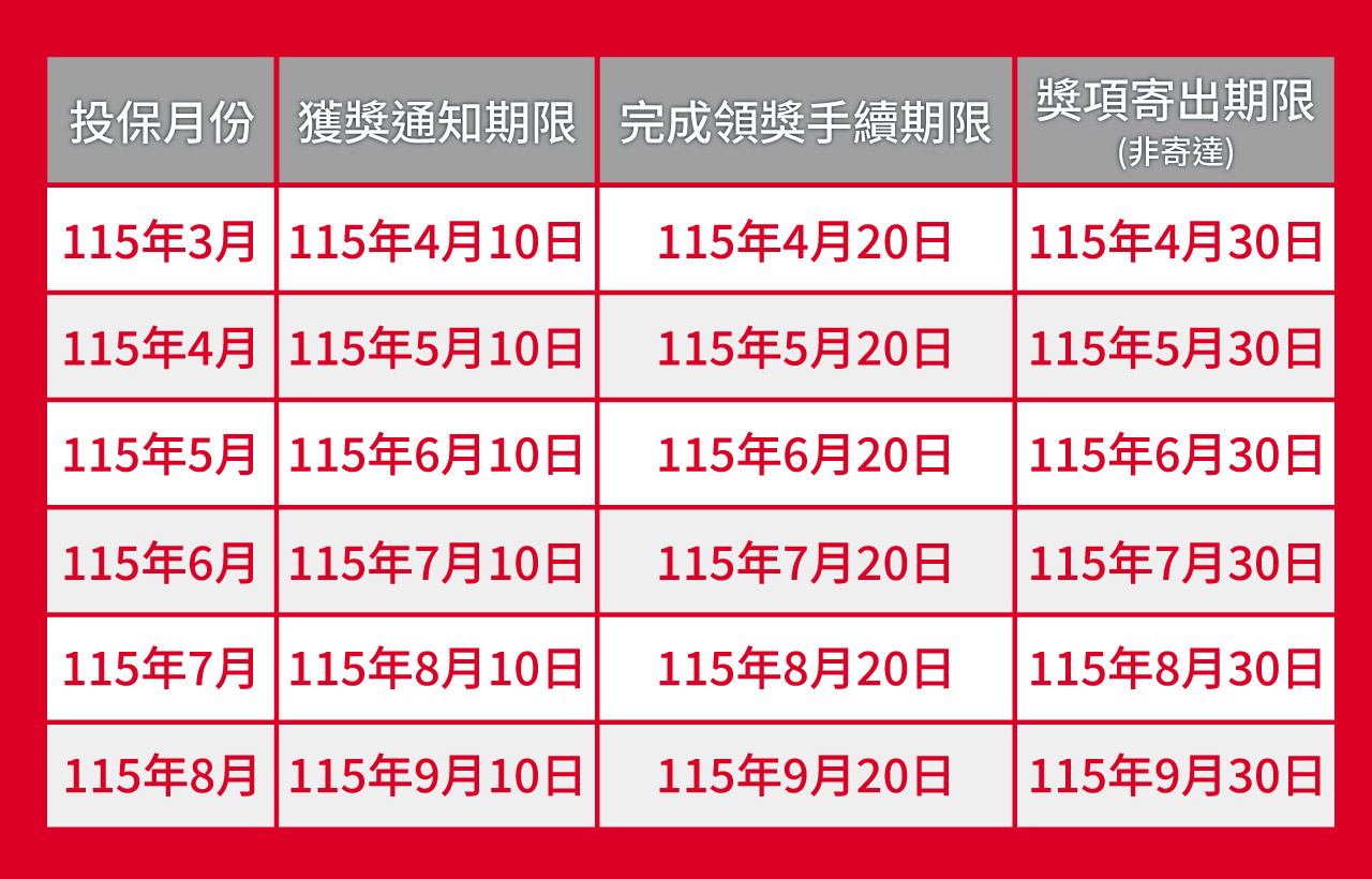 3.本活動每月獲獎名單會由主辦單位以電子郵件寄發獲獎通知,獲獎者於通知期限內完成領獎手續,並經主辦確認資訊無誤後寄出獎項。獲獎者未於期限內完成領獎手續,則視同放棄。活動相關時程如下。